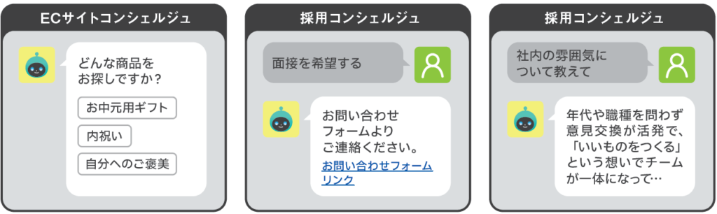 例:「どんな商品をお探しですか?」→「お中元ギフト/内祝い/自分へのご褒美」などの選択肢を提示。用途や価格帯に合わせておすすめ商品へ誘導します(購入導線の短縮)。 - 採用コンシェルジュ(応募導線サポート)