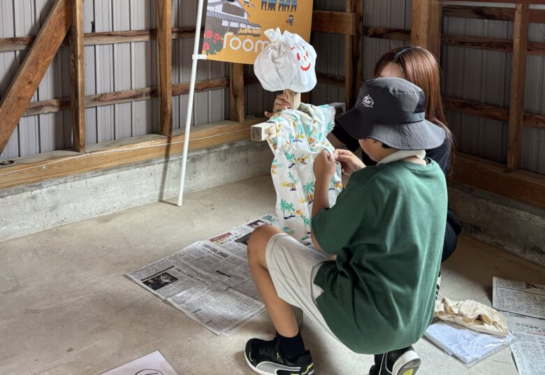 次は「田んぼの番人」となるかかし作り。参加者それぞれが不要になった衣類を持ち寄り、支柱に服を着せたり、顔をつけたりしながら形を作っていきました。顔はペンで描いていき、表情もデザインも本当にさまざま。